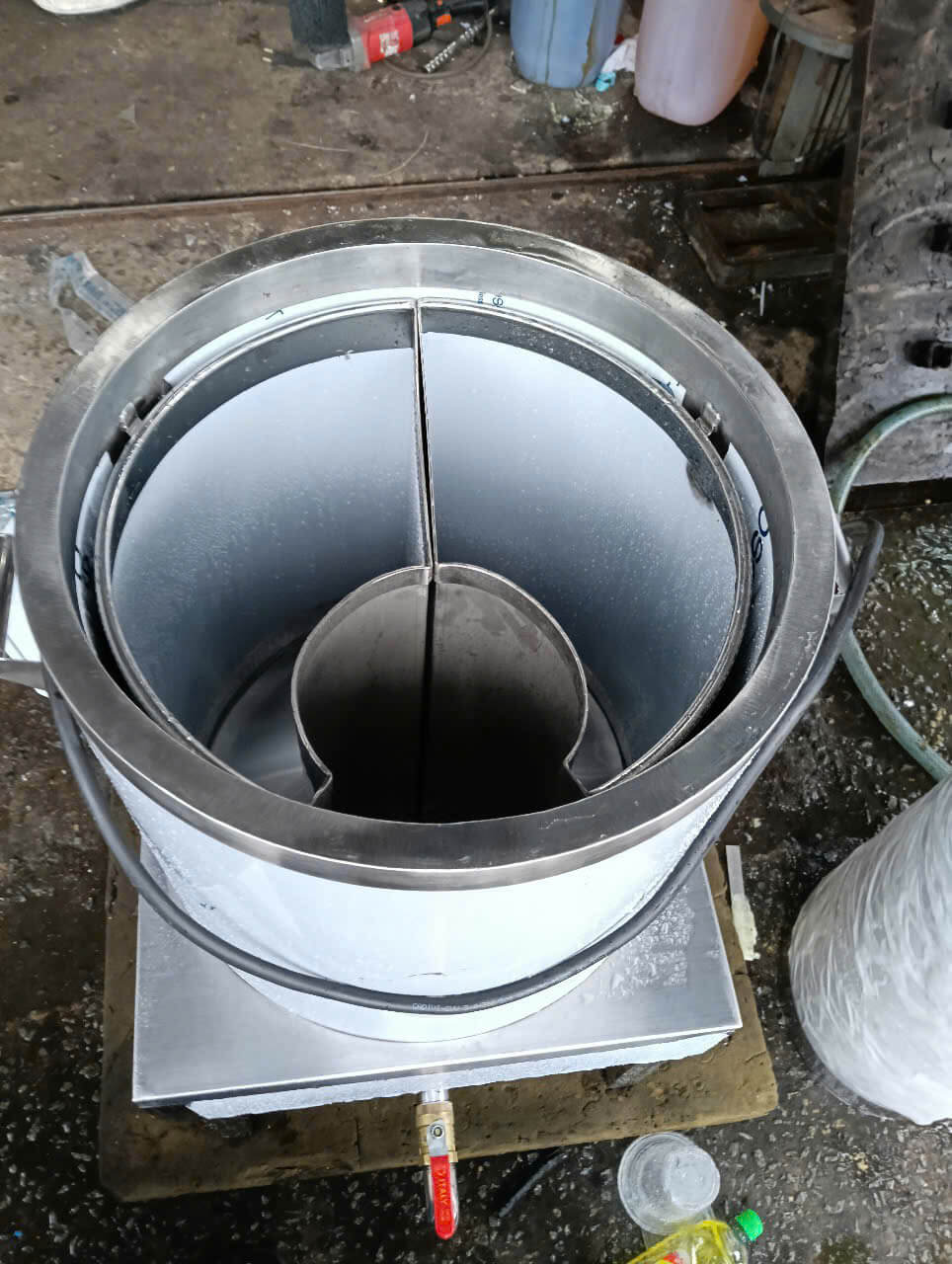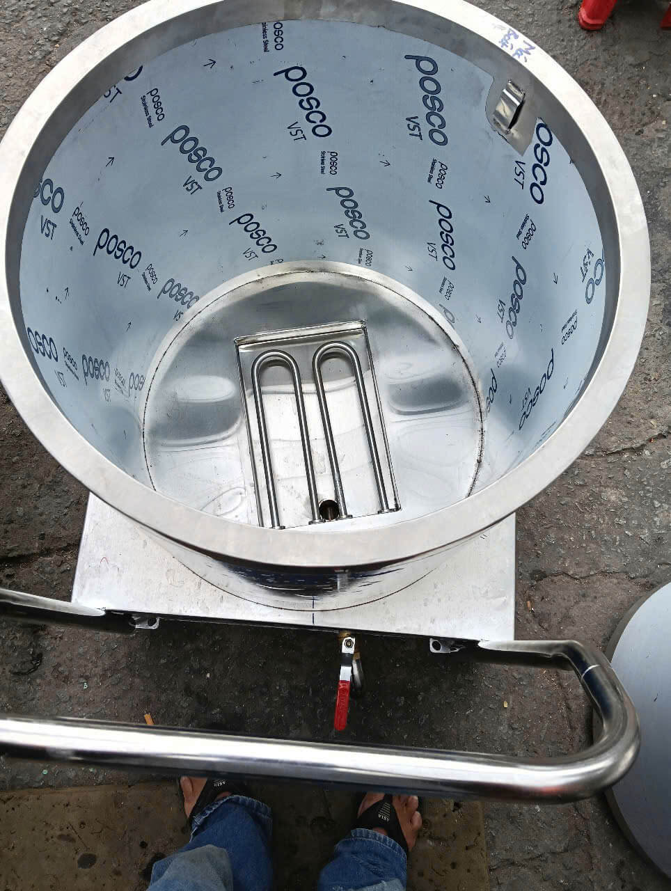 - Mở van xả đáy để xả hết cháo thừa và dùng vòi nước xịt rửa sạch bên trong lòng nồi.